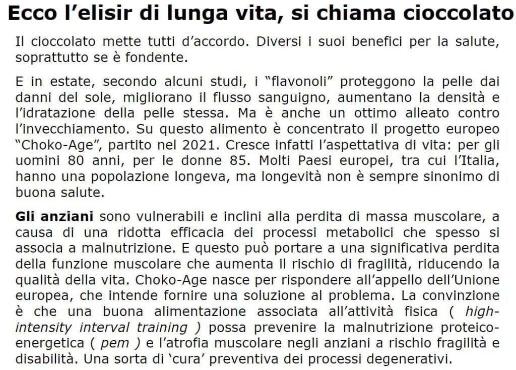 [English 🇬🇧, Italiano 🇮🇹 sotto] From the University of Verona’s online magazine: https://www.univrmagazine.it/2022/07/06/il-cioccolato-per-combattere-la-malnutrizione-e-la-fragilita-negli-anziani/ The Choko-Age project, aimed at over 65 with cognitive decline, is underway Can chocolate, one of the most popular sweets, rich in vitamin E and polyphenols, also help in reducing the risk of protein-energy malnutrition and frailty in the elderly with cognitive […]